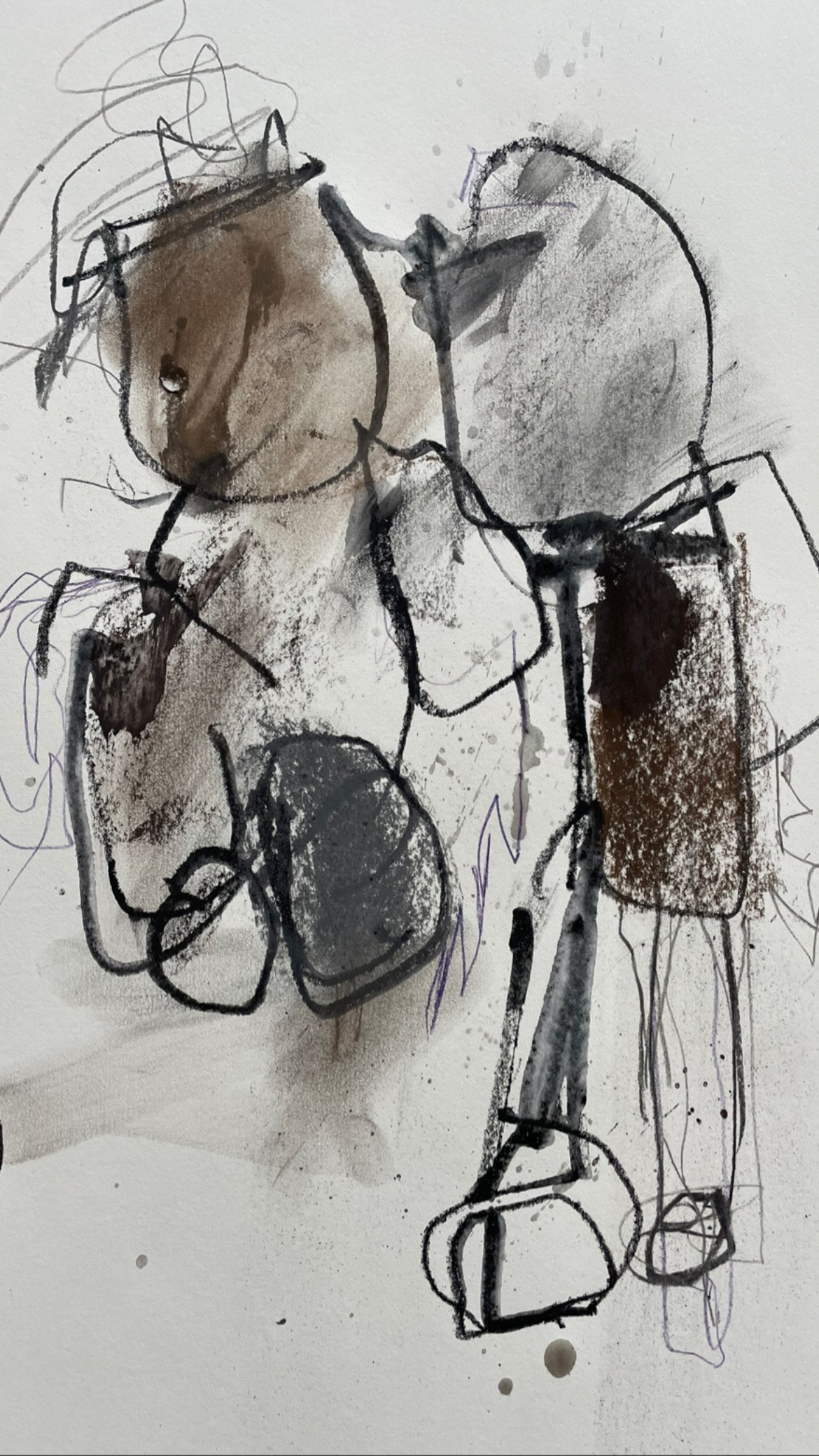 Through the spontaneous intuitive process of automatism, my abstract drawings become a physical record of my unconscious thoughts and feelings. It is a call and response to a universe within that frees me to see, with a renewed perspective, the world and myself. Working on paper, wood, or canvas with mixed media and a dynamic range of implements, expressive strokes, drips, and marks reveal a raw immediate record of my physical, and emotional energy. Visible seams and uneven surfaces are evidence of my imperfection and transformative process. In their state of becoming, implied figures suggest my humanity, evoking a whole, tied to some ‘thing’ larger.